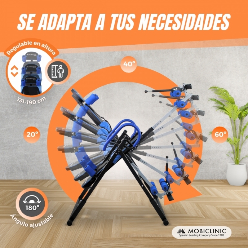 Su pasamanos ajustable te permite variar el ángulo de inclinación para 20º , 40º y 60º y se puede utilizar de forma libremente vertical con inclinaciones de 0 a 180 grados. Al llegar a los 180º la tabla no se puede mover más, imposibilitando que se haga un giro completo de 360º. Esta versatilidad te permite adaptar tu sesión de inversión según tus necesidades y preferencias individuales.