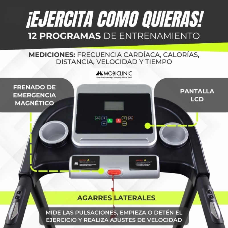SISTEMA DE SEGURIDAD MAGNÉTICO: la cinta de correr y andar Etna cuenta con un sistema de paro de emergencia magnético que te permitirá realizar tu entrenamiento con total seguridad sin pensar en caídas accidentales, pues en caso de que esto sucediera, simplemente con pulsar el botón rojo, la máquina se pararía inmediatamente. También sus brazos laterales permiten apoyarte en ellos si es necesario.