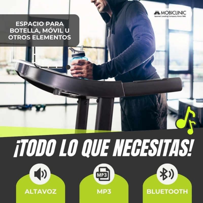 PANTALLA LCD CON BLUETOOTH, ALTAVOZ Y SOPORTE: esta cinta dispone de una pantalla LCD donde tendrás toda la información accesible y disponible para consultar (tiempo de entrenamiento, programa seleccionado, frecuencia cardíaca...). Además, tiene altavoz para escuchar música mientras haces deporte mediante Bluetooth llamado FS-C98A35-A y una zona para botella de agua y móvil.