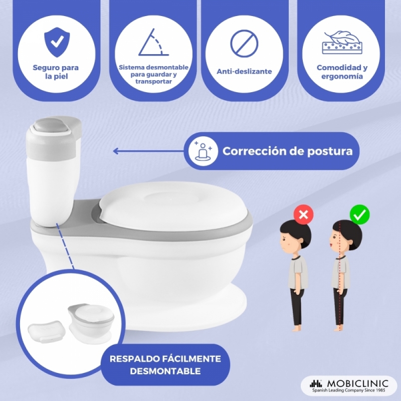 El diseño de este inodoro para bebés está pensado para garantizar la comodidad y la correcta postura del menor gracias a su respaldo. Igualmente, su superficie antideslizante evitará algún que otro accidente o que pueda desplazarse el producto con facilidad.