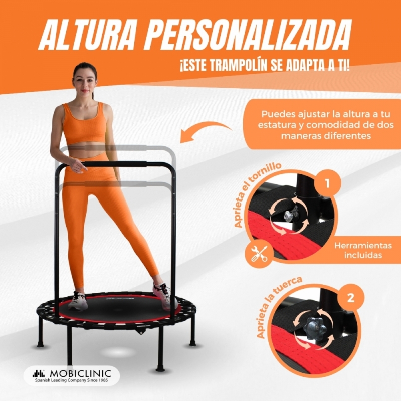 REPOSABRAZOS CON ALTURA REGULABLE: ¡El trampolín redondo Kangumobi es adecuado para todas las edades ya que se adapta a la altura del usuario! Tiene un rango de altura personalizable de cuatro posiciones: 92, 98, 104 y 111 cm, regulándose al gusto del consumidor. Se puede regular si se colocan los tornillos en flor, si se usan los tornillos clásicos el reposabrazos será fijo aunque con estos podemos regular la altura usando una llave allen.