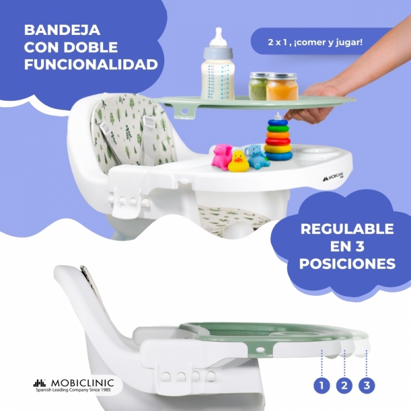 CON BANDEJA AJUSTABLE EN 3 NIVELES: De esta manera, la trona Forest es muy práctica ya que deja brinda espacio para el movimiento del pequeño según la actividad que esté realizando. La bandeja es extraíble y es doble.