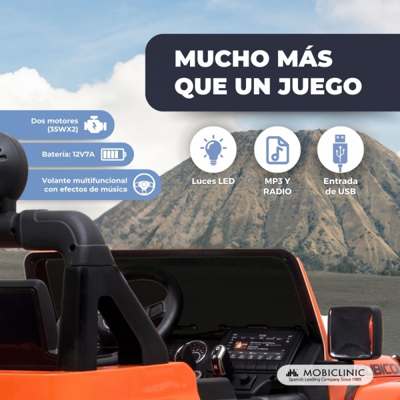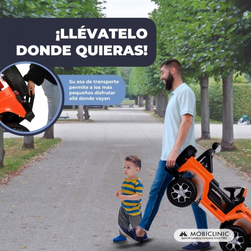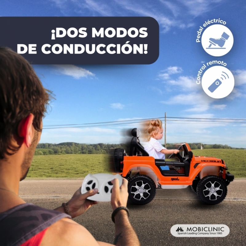 El coche eléctrico MobiRoad, con licencia Jeep Wrangler Rubicon, es la opción ideal para los niños que buscan una experiencia de conducción emocionante y segura. Diseñado con un enfoque en la diversión, seguridad y realismo para niños desde 3 a 7 años de edad. En él se sentirán auténticos conductores, debido a la experiencia de conducción realista que ofrece, equipado con pedal eléctrico que permite tener el control del vehículo y un mando a distancia para una mayor tranquilidad de la familia, además de una llave realista con la que arrancar el coche. Cuenta también con un volante interactivo dónde los pequeños podrán activar la bocina y cambiar la música. Su autonomía es de 2 a 3 horas de funcionamiento.