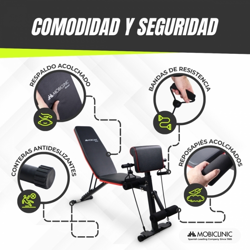 ENTRENAMIENTO COMPLETO: Este banco de musculación ajustable te permite realizar una amplia variedad de ejercicios, desde press de banca, abdominales, hasta flexiones y ejercicios de brazos y pecho. Es ideal para entrenamientos funcionales y específicos, aptos para principiantes y usuarios más avanzados. Además, incluye cintas de resistencia para ampliar las opciones de entrenamiento y trabajar más grupos musculares.