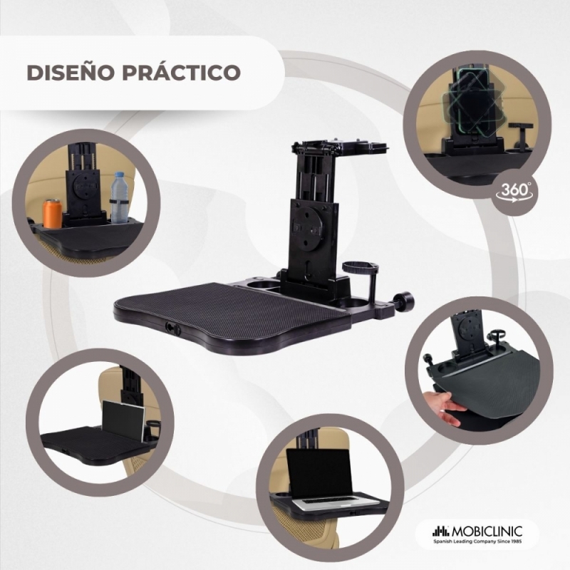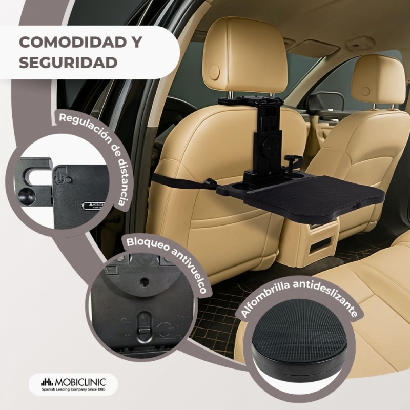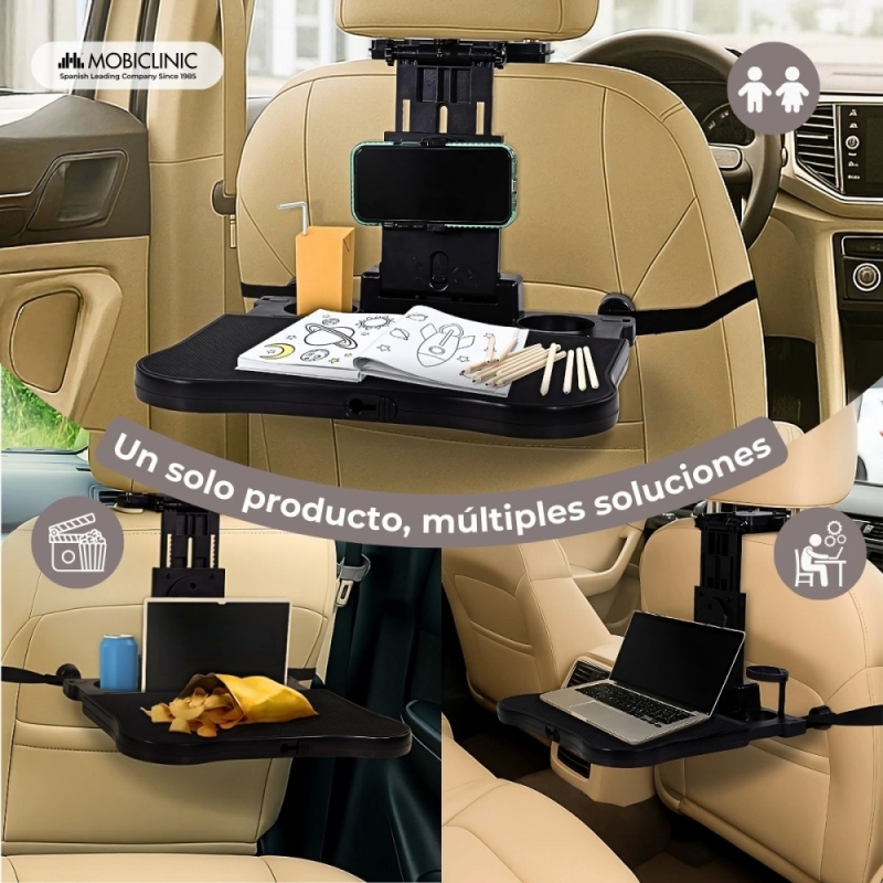 Esta mesa auxiliar no solo ofrece un diseño funcional, sino también varios complementos que mejoran la experiencia del usuario. Un gancho 360º para el móvil que permite colocar el dispositivo en diferentes posiciones. También incluyen una ranura especialmente diseñada para tablets, proporcionando una fijación segura que mantiene el dispositivo seguro durante todo el trayecto.