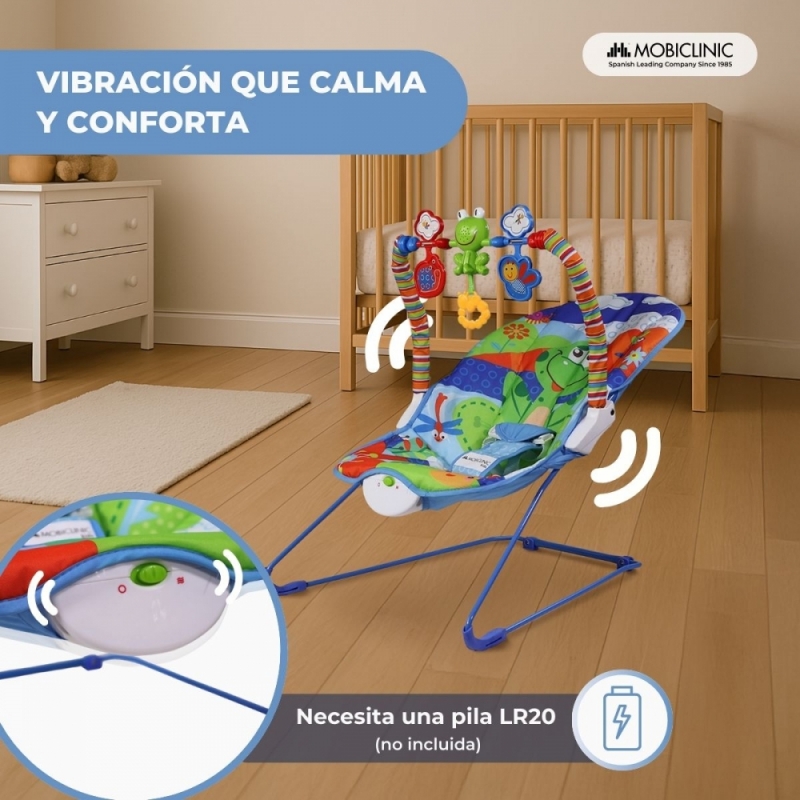 Para la opción de descanso, dispone de un sistema de vibración relajante que ayuda a calmar al bebé. Esta función es perfecta para crear un ambiente tranquilizador y cómodo. La hamaca incluye también juguetes interactivos que fomentan el desarrollo sensorial del bebé, proporcionando estímulos visuales y sonoros para llamar su atención.