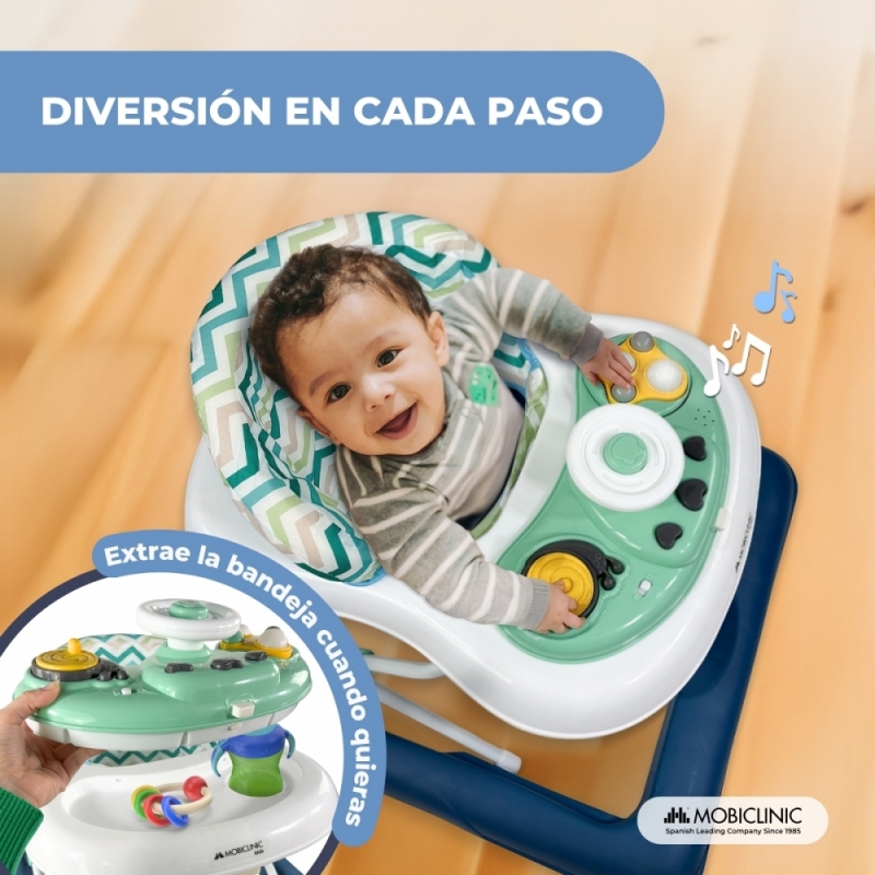 Cuenta con una bandeja interactiva, equipada con tres juguetes, luces y música, manteniendo siempre entretenido al bebé mientras interactúa y explora. La bandeja es extraíble, lo que permite que el bebé pueda jugar con ella por separado, ofreciendo así una opción más de diversión.