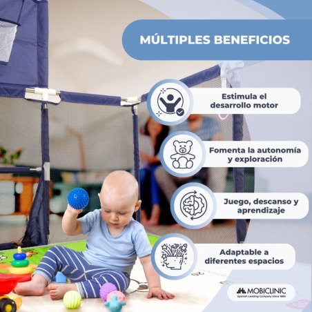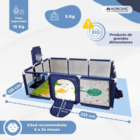 Gracias a sus dimensiones de 128 x 233 cm ofrece una zona de juego amplia y cómoda, donde el pequeño podrá gatear, incorporarse, jugar o practicar sus primeros pasos con seguridad. la colchoneta incluida proporciona además una superficie acolchada que aísla del suelo y mejora la experiencia de juego o descanso.