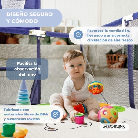 Para fomentar la autonomía y coordinación de los más pequeños, el parque cuenta con 4 anillas de sujeción diseñadas para que aprender a ponerse de pie progresivamente y de forma segura. Sus paredes de malla transpirable permite a los padres vigilar al bebé en todo momento y además asegura una ventilación de la zona constante.