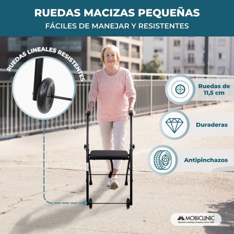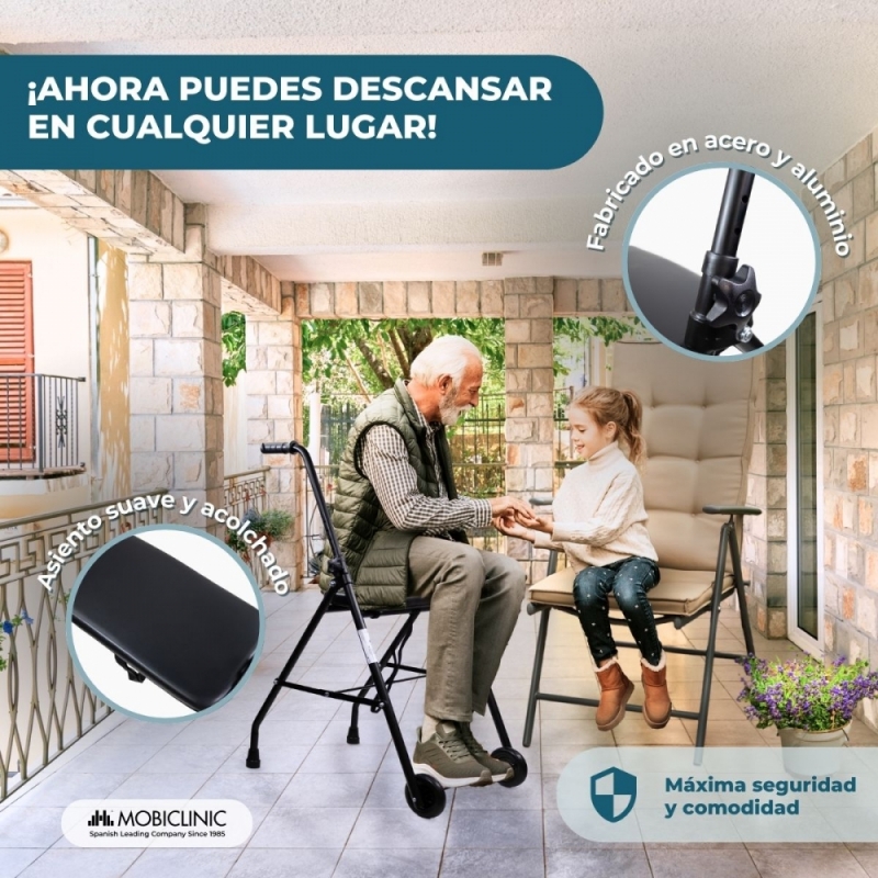 CÓMODO: gracias a sus puños anatómicos y su asiento de PVC acolchado, no solo es un andador ortopédico cómodo para desplazase sino también para descansar.