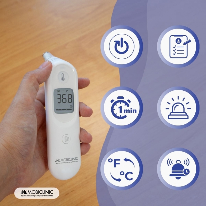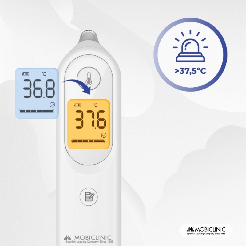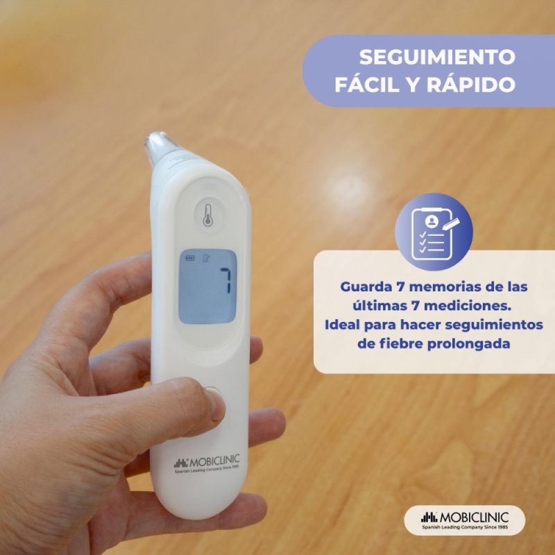 Su punta suave y moldeada está pensada para un uso seguro en el oído. Cuenta con un sistema de alerta inteligente que detecta si a temperatura supera los 37,5 ºC y emite un pitido largo seguido de tres cortos junto a la iluminación de la pantalla en color naranja, avisando de manera clara y rápida al usuario. Otra de sus grandes ventajas es su memoria integrada, almacena las últimas 7 mediciones permitiendo un seguimiento para conocer la evolución en casos de fiebre prolongada.