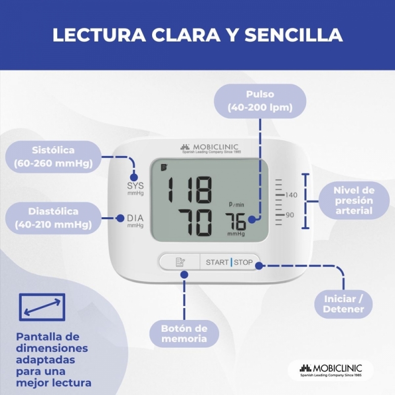 Mide con exactitud en un rango de 0 a 300 mmHg (0 a 40,0 kPa), permitiendo además medir los resultados en dos unidades diferentes: kPa o mmHg, según preferencia.