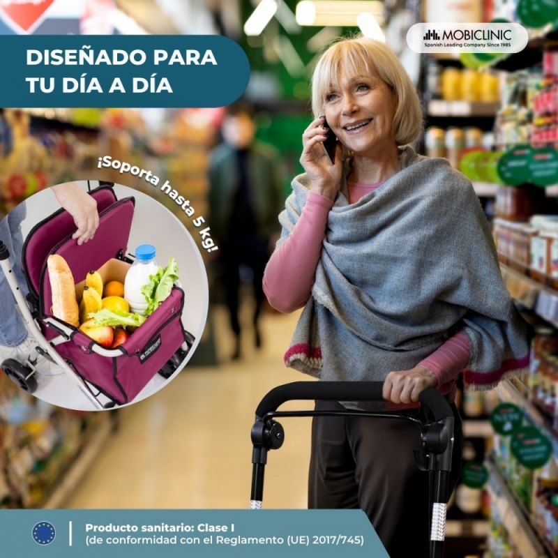 CON BOLSA DE LA COMPRA: El andador shopping Coliseo cuenta con una bolsa para guardar la compra, la cual es extraíble y desmontable, impermeable, lavable y soporta hasta 5 kg.