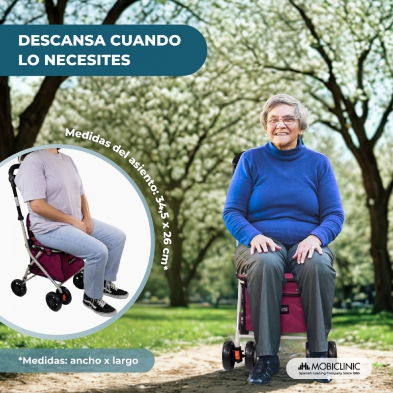 Además, este carro compra cuenta con un asiento acolchado, cómodo y resistente para poder descansar durante el paseo o mientras se esperan las grandes colas en el mercado. Asimismo, cuenta con un respaldo que permite relajar la espalda y una bolsa para guardar la compra, la cual es extraíble, impermeable, lavable y soporta hasta 5 kg. El carro de la compra Coliseo es monomando lo que permite al usuario utilizarlo con una sola mano mientras que, por ejemplo, pasea al nieto o al perro. También es regulable en altura, con tres posiciones disponibles: 86,5 cm, 91,5 cm y 96,5 cm, lo que permite adaptarlo a la estatura del usuario y mantener una postura cómoda y ergonómica durante su uso.