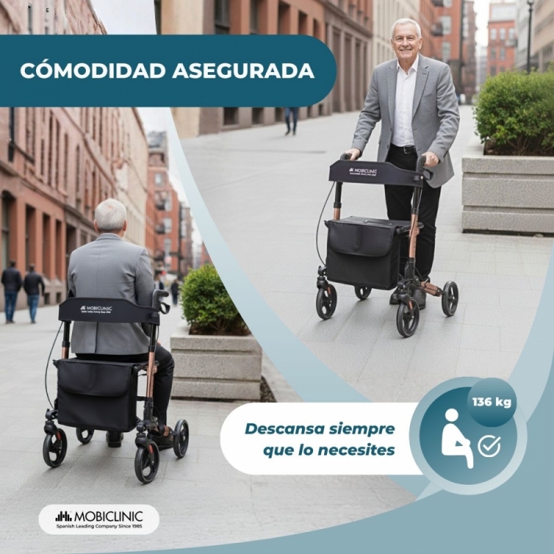 Andador plegable | Aluminio | Hasta 136 Kg | Frenos en manetas | Asiento y respaldo | Oro Rosa | Trajano | Deluxe | Mobiclinic
