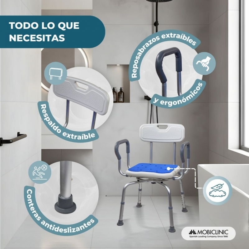 COMODIDAD Y APOYO EXTRA: Esta silla de baño dispone de apoyabrazos ergonómicos que ofrecen gran apoyo al levantarse o sentarse, ofreciendo confianza y evitando esfuerzos. El asiento y respaldo cuentan con superficie EVA PAD antideslizante que ofrece un apoyo cómodo y suave incluso en entornos húmedos.