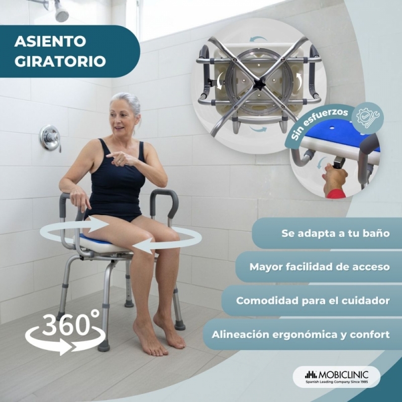 ASIENTO GIRATORIO 360º: La banqueta de baño cuenta con asiento giratorio que permite cambiar de posición sin tener que realizar giros forzados del cuerpo, reduciendo el riesgo de caídas o lesiones. Además, para mayor seguridad, dispone de un sistema de bloqueo que mantiene la estabilidad del asiento durante el uso para mayor seguridad y control.