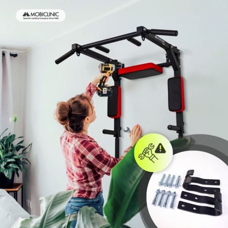 CONFORT Y SEGURIDAD: La barra de dominadas incluye un cojín de respaldo y apoyos acolchados en codos, resistente a impactos y diseñados para ofrecer más estabilidad durante los ejercicios. Además, cuenta con un sistema de anclaje con 4 ganchos que garantiza una buena fijación a la pared y evita posibles movimientos indeseados.