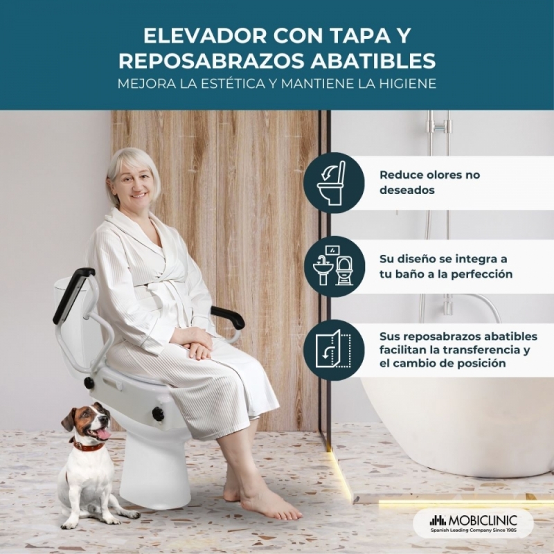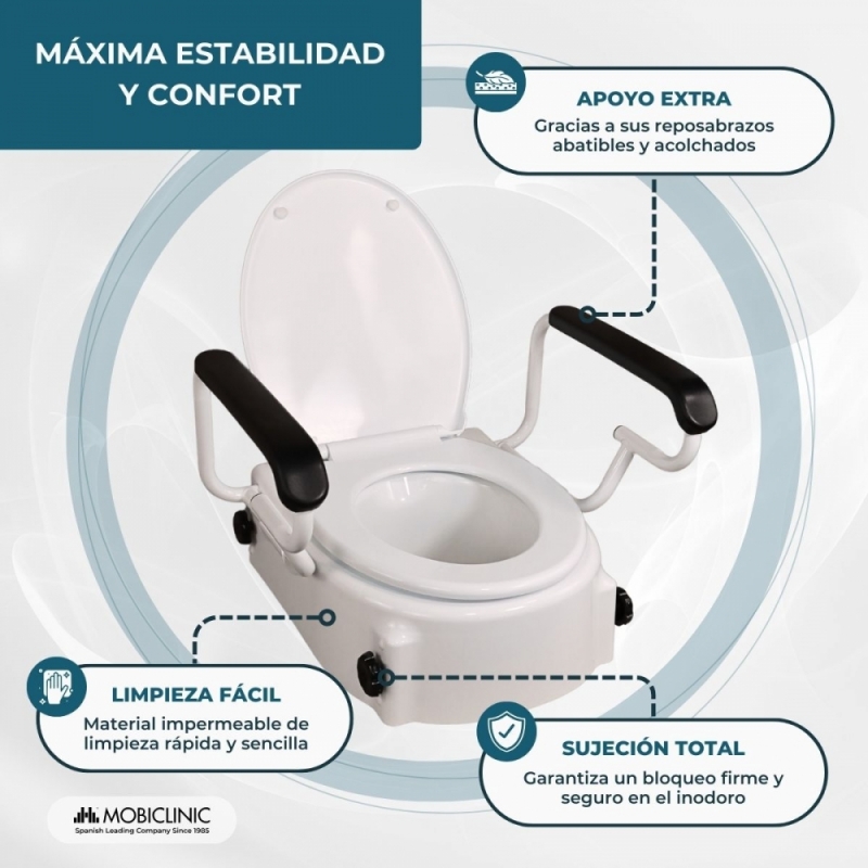 CONFORT Y DESCANSO: la fácil regulación e inclinación de los reposabrazos abatibles de este elevador WC y sus 19 cm de elevación lo convierten en un inodoro muy confortable y cómodo a la hora de sentarse e incorporarse. Además, puede soportar hasta un máximo de 100 kg.