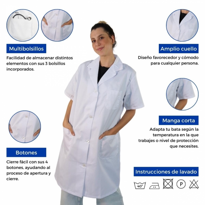 Bata sanitaria para mujer | Manga corta | Cuello y bolsillos | Fácil lavado y planchado | Blanca | Varias tallas | Mobiclinic