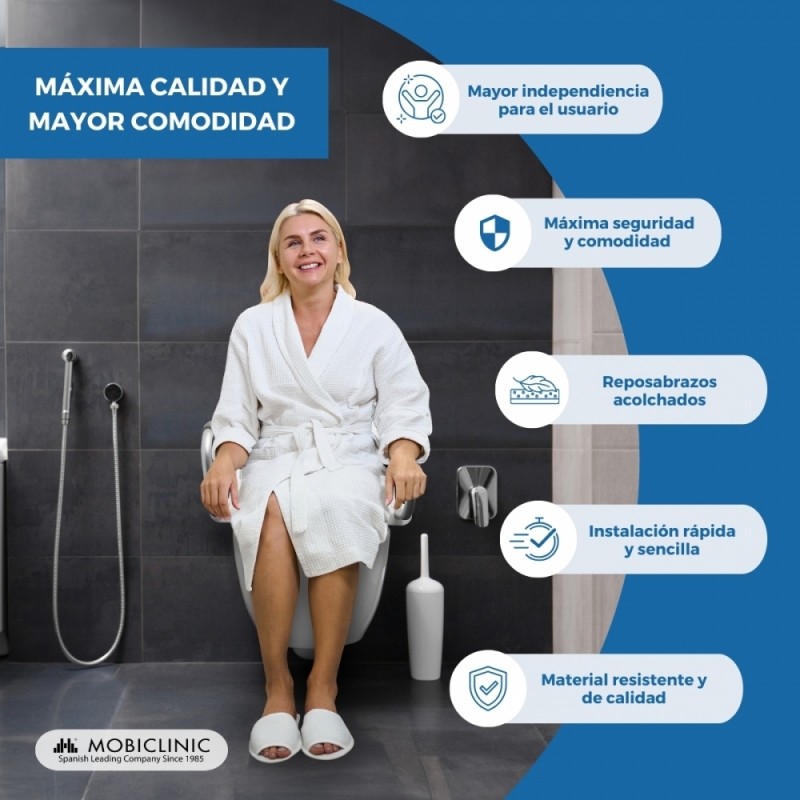 - Sus reposabrazos abatibles que ayudan en la salida del inodoro.