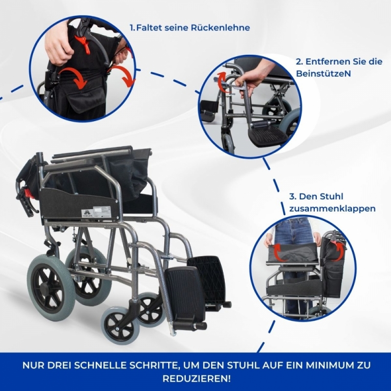 Als Besonderheit verfügt dieser Faltrollstuhl über ein Faltsystem, mit dem Sie durch enge Stellen fahren und ihn anschließend wieder öffnen können, sowie über ein Faltsystem der Rückenlehne, das Ihnen die Möglichkeit gibt, ihn überall zu verstauen.
