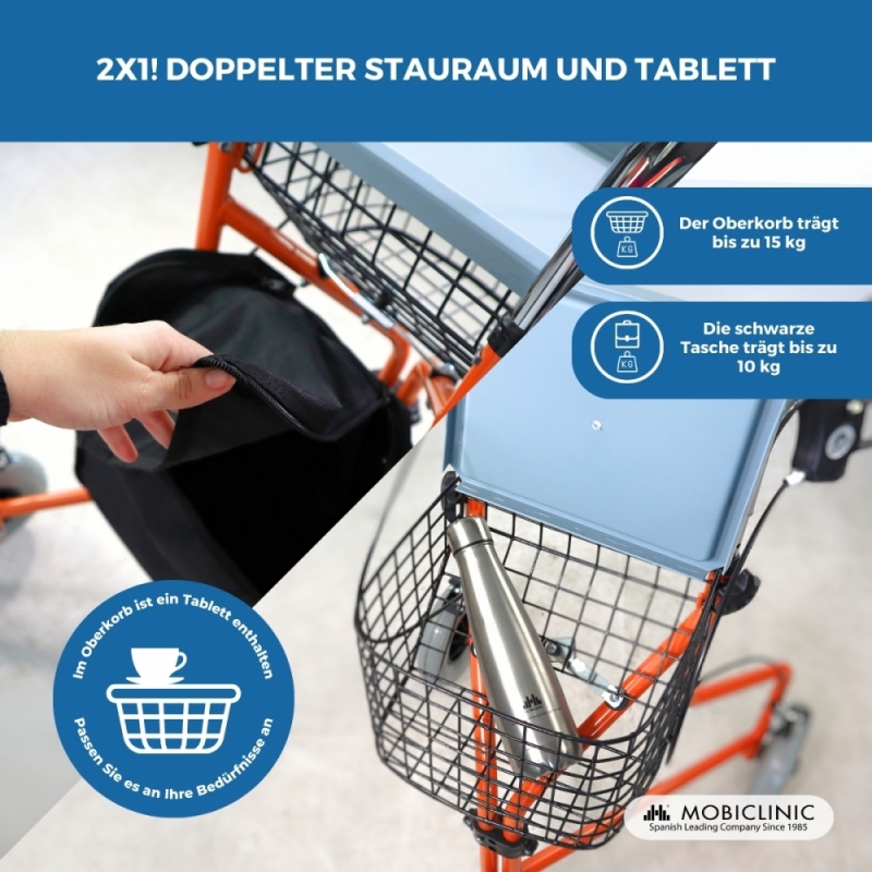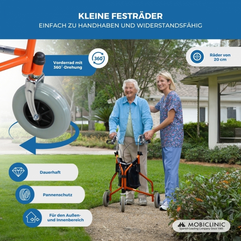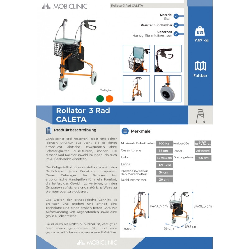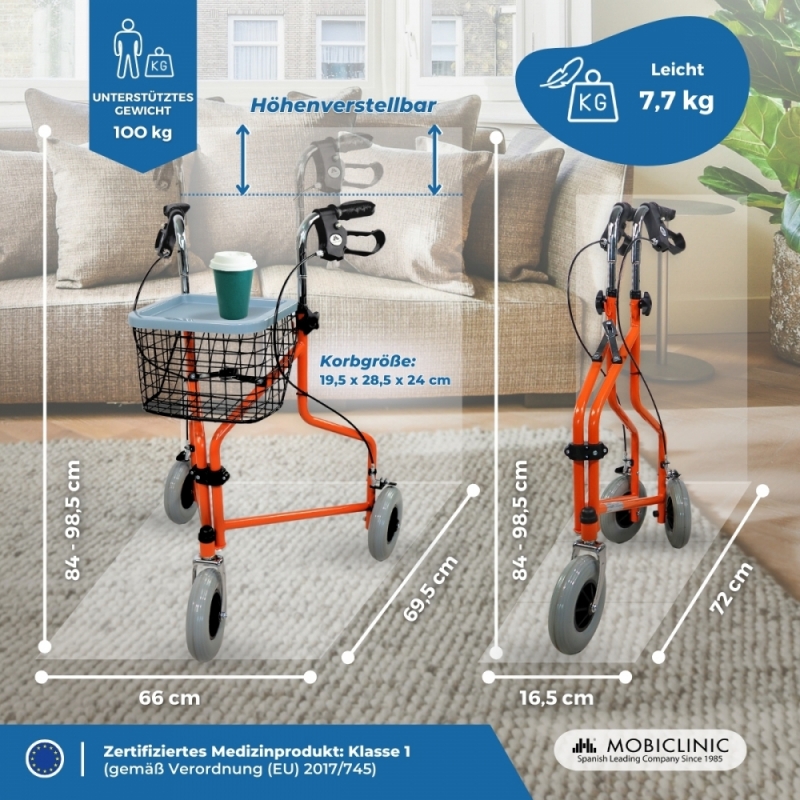 Rollator | 3 Rad | Faltbar | Verstellbar | Korb | Tragetasche | Orange | Caleta | Mobiclinic