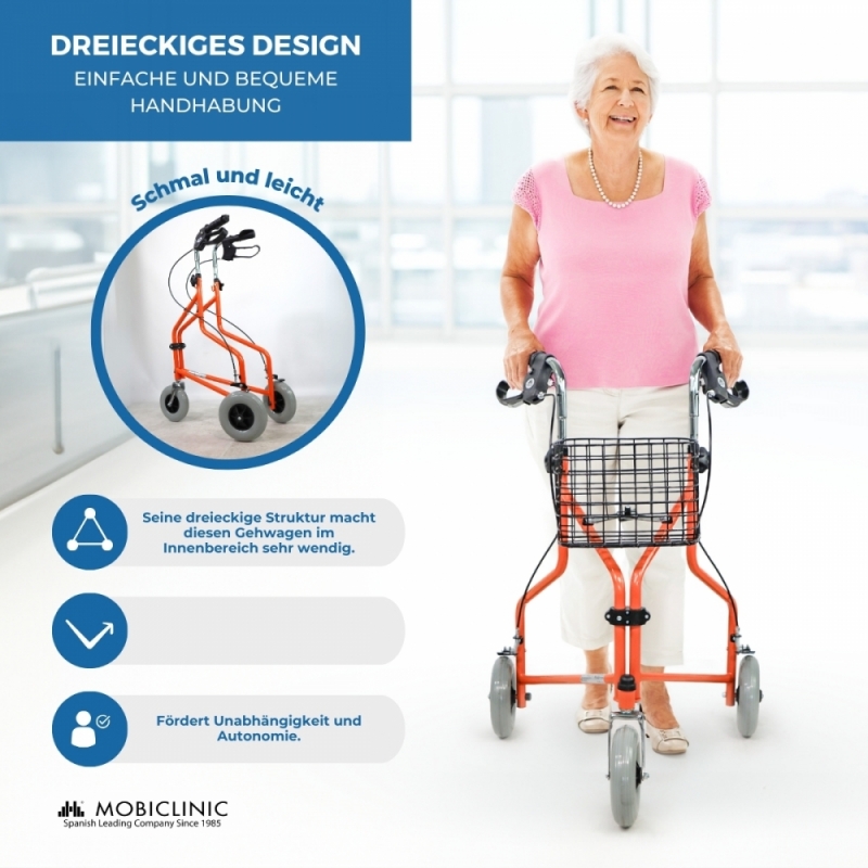 Dieser Rollator für Senioren mit drei Rädern ist geeignet für Menschen mit Mobilitätseinschränkung, die sich in der Behandlung oder während der Rehabilitation befinden, da sie ihnen die nötige Stabilität bei ihren Bewegungen und Spaziergängen gibt.
