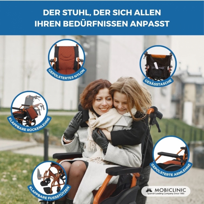 Faltbarer Rollstuhl | Aluminium | Bremse an Handgriffen | Fußstütze | Armlehnen | Orange | Modell: Pirámide | Mobiclinic