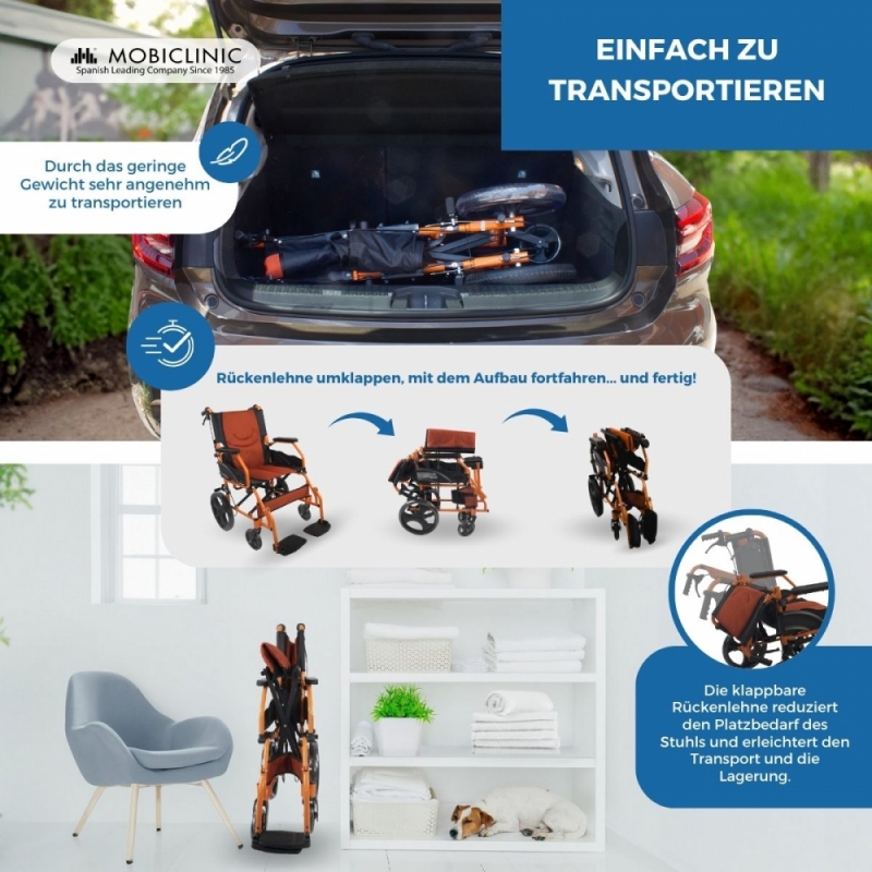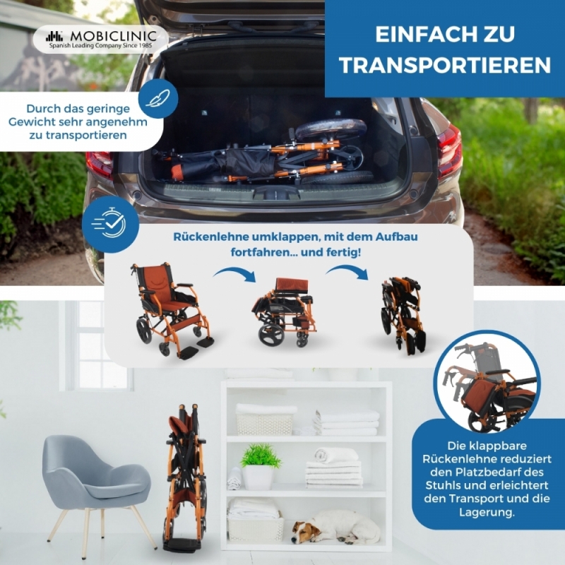 Dank des faltbaren Rollstuhlrahmens können Sie ihn auch an engen Stellen einsetzen und später wieder aufklappen. Und er nimmt nur sehr wenig Platz in Ihrer Wohnung ein.