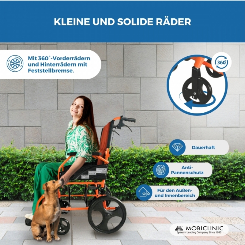Dieses Produkt ist mit einem Satz stabiler Räder ausgestattet. Diese Eigenschaft eliminiert das Risiko einer Panne und macht ihn zum perfekten Pflegerollstuhl für den Innenbereich.