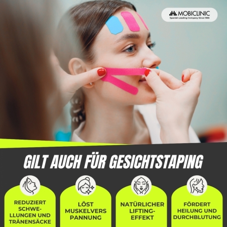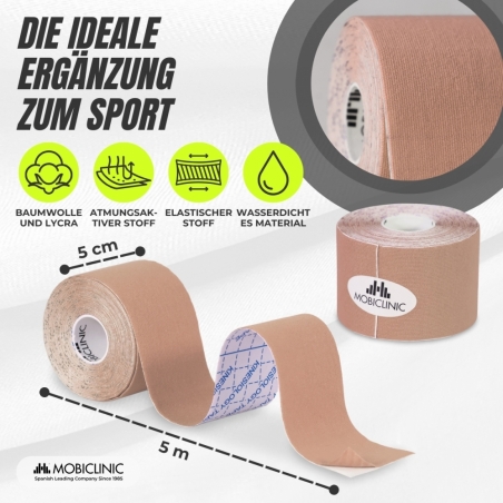 Dieses Kinesiotape hat eine Breite von 5 cm und eine Länge von 5 m und ist auf Wunsch von Therapeuten, die die Vorteile der Chromotherapie bei dieser Art von Produkten schätzen, in verschiedenen Farben erhältlich.