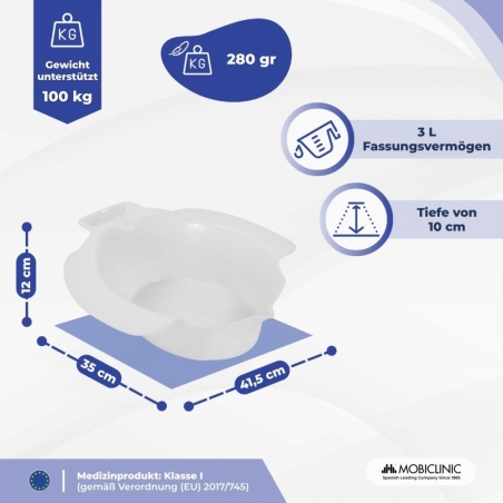 Dieses Bidet aus Polypropylen ist stabil, langlebig und leicht. Mit einem Gewicht von 280 Gramm und einem Fassungsvermögen von 4 Litern ermöglicht es eine optimale Reinigung mit warmem Wasser. Die Tiefe von 10 cm ermöglicht ein komfortables Eintauchen ohne Verschütten. Es ist leicht zu verstauen und zu transportieren und eignet sich perfekt für den Einsatz zu Hause oder in der Praxis.