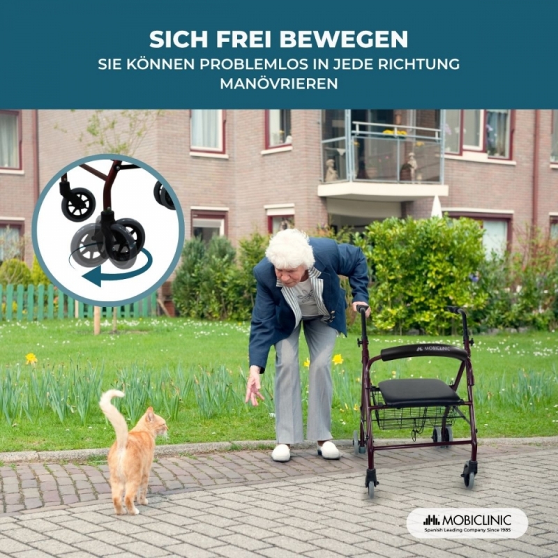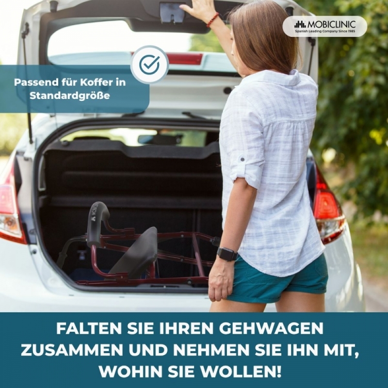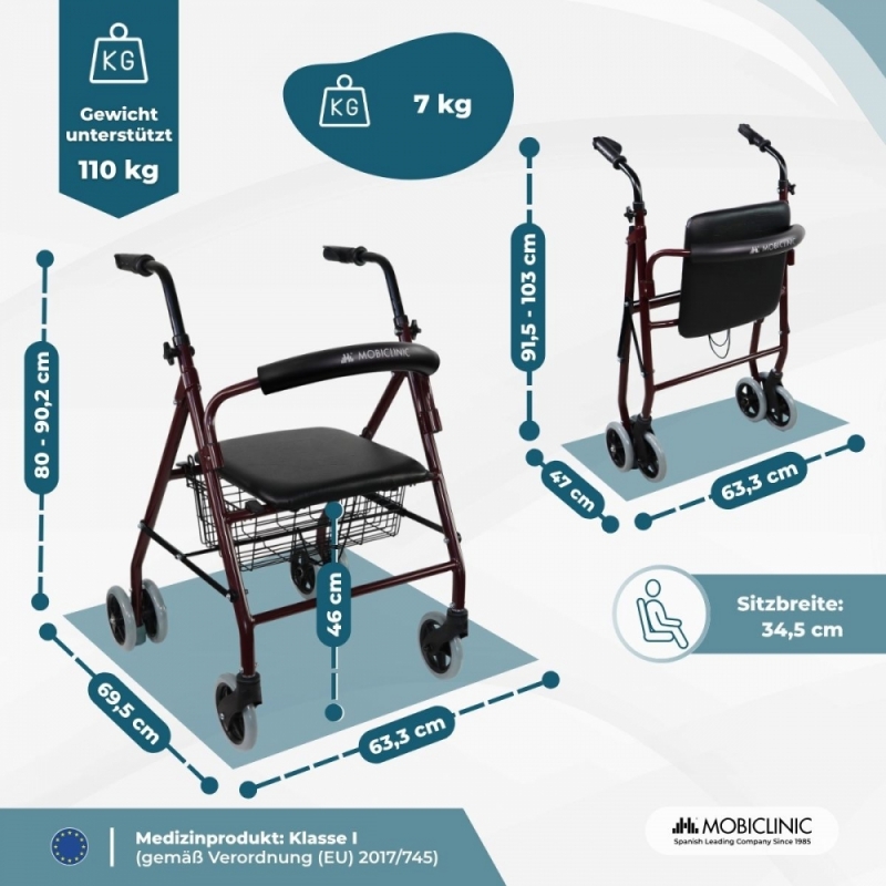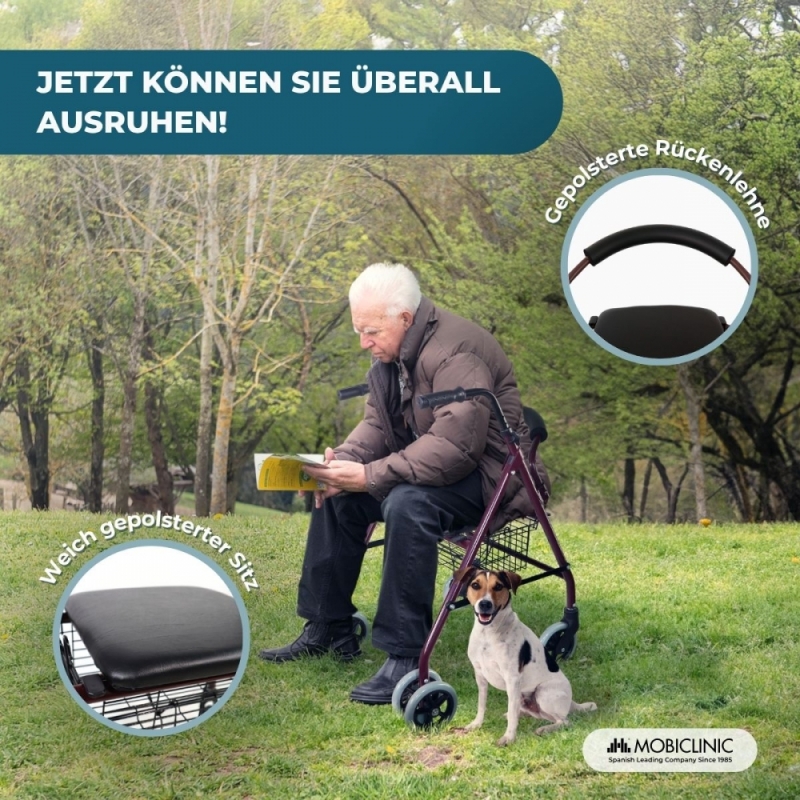 Klappbarer Rollator | Sitz und Rückenlehne | Aluminium | Korb | Für ältere Menschen | Bordeaux | Modell: Prado | Mobiclinic