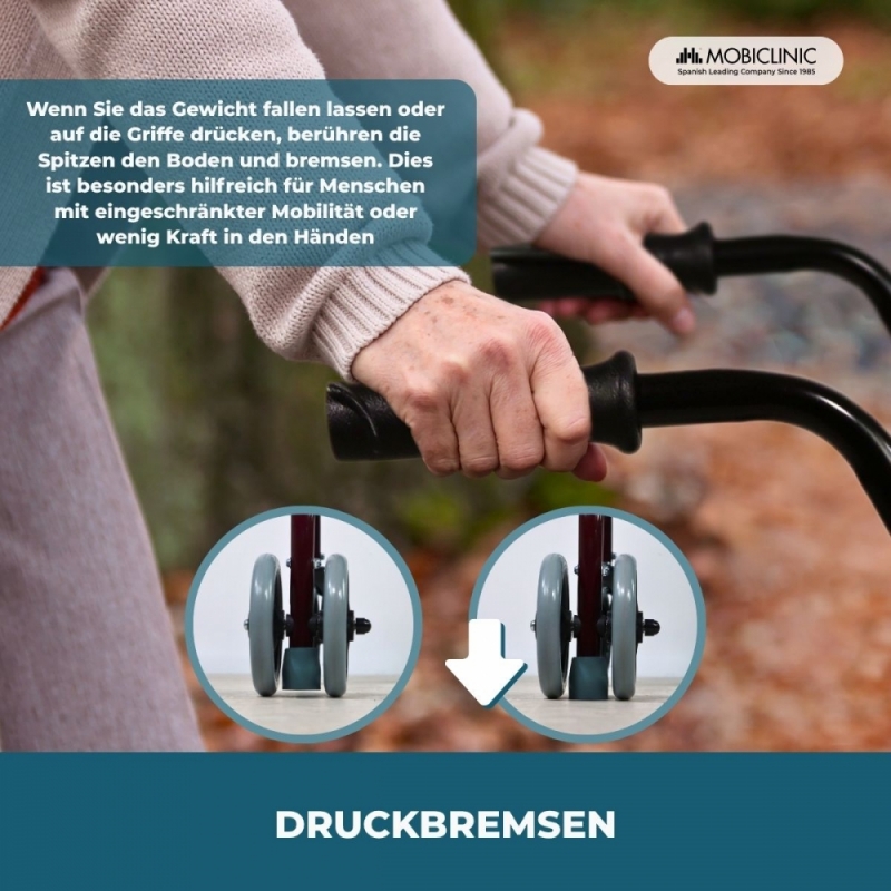 - Sie hat zwei Vorderräder, die sich um 360º drehen lassen, einen bequemen Sitz, auf dem man sich ausruhen kann, eine gepolsterte Rückenlehne und Bremsen, die durch Druck auf die Griffe aktiviert werden (das Gewicht des Körpers wird auf die Griffe übertragen).