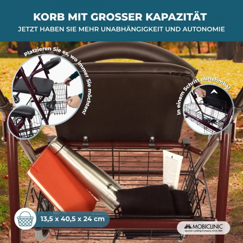 - Sie hat einen Einkaufskorb, der unter dem Sitz oder an der Vorderseite der Gehhilfe angebracht werden kann.