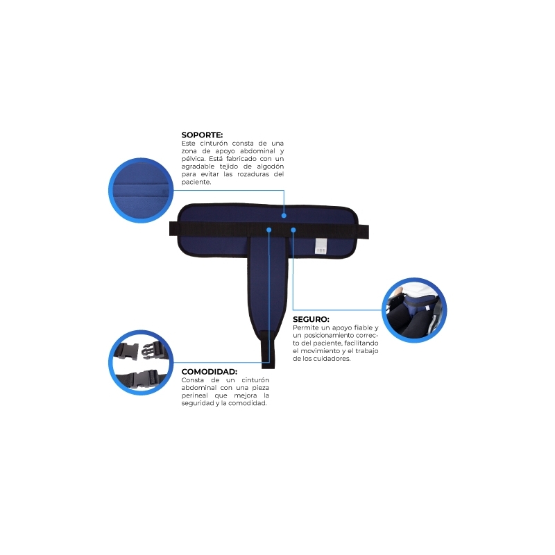 Der Gürtel verfügt über einen Bauchgurt mit einem Dammteil, der die Sicherheit und den Komfort des Patienten verbessert.