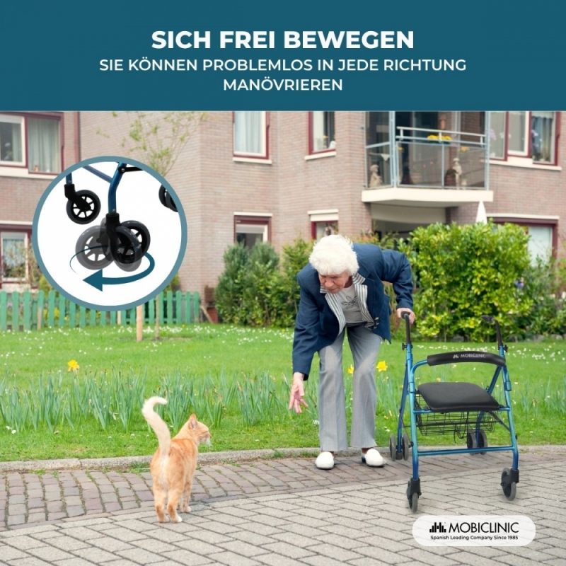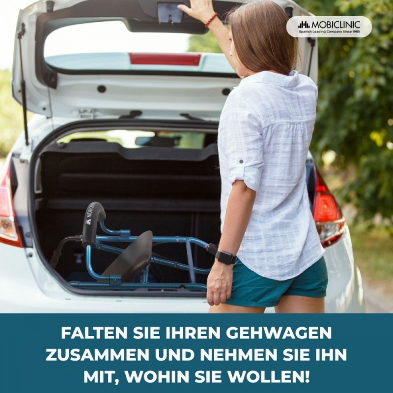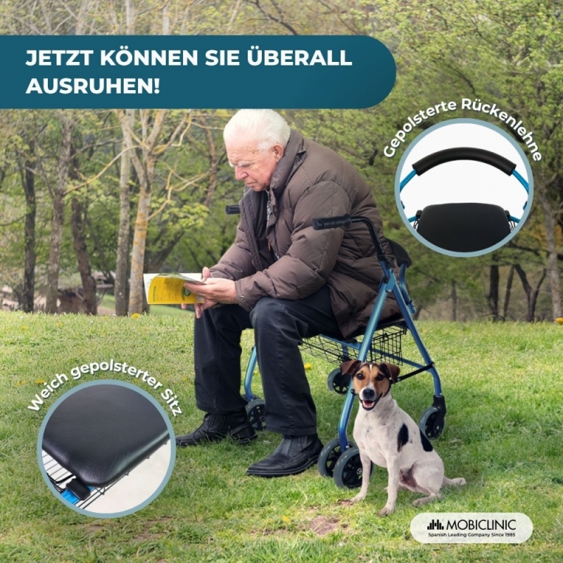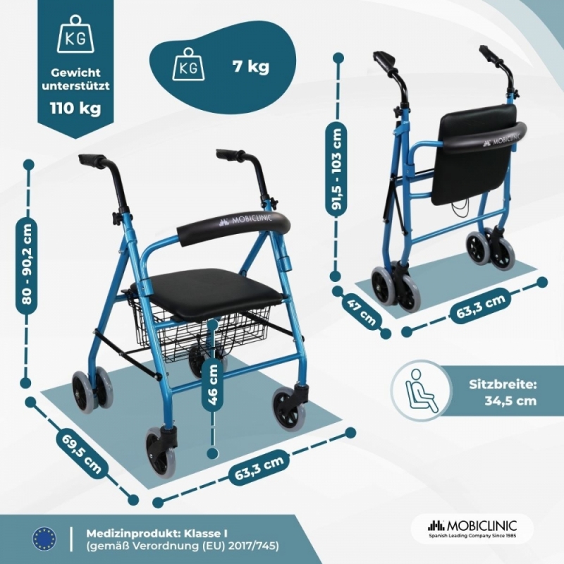Klappbarer Rollator | Sitz und Rückenlehne | Aluminium | Korb | Für ältere Menschen | Blau | Modell: Prado | Mobiclinic