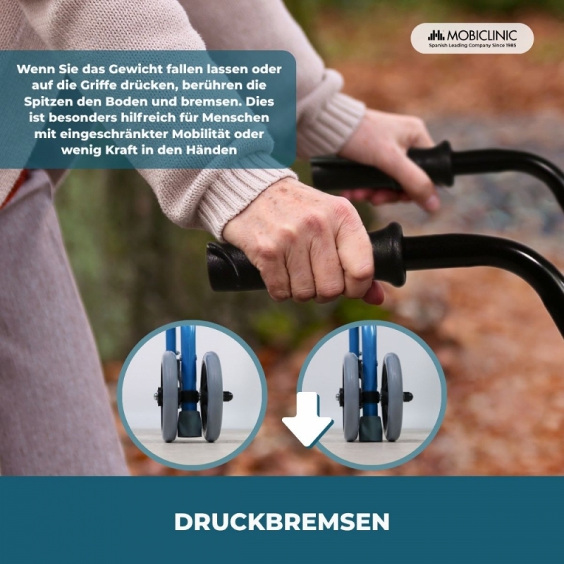 - Sie hat zwei Vorderräder, die sich um 360º drehen lassen, einen bequemen Sitz, auf dem man sich ausruhen kann, eine gepolsterte Rückenlehne und Bremsen, die durch Druck auf die Griffe aktiviert werden (das Gewicht des Körpers wird auf die Griffe übertragen).