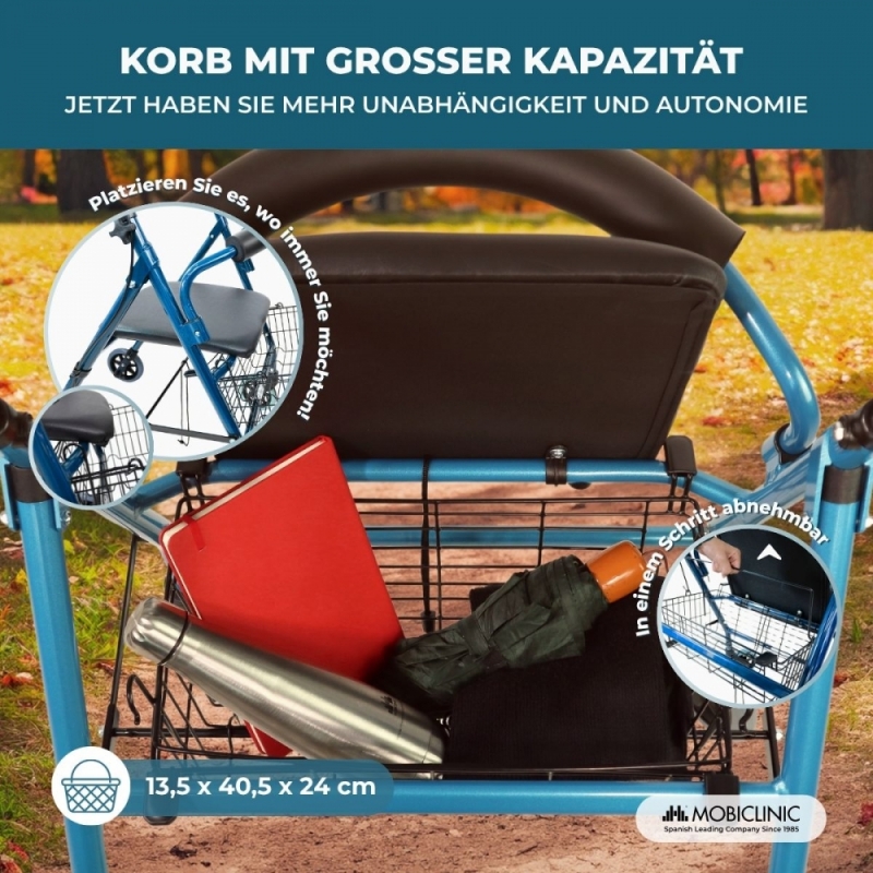 - Sie hat einen Einkaufskorb, der unter dem Sitz oder an der Vorderseite der Gehhilfe angebracht werden kann.