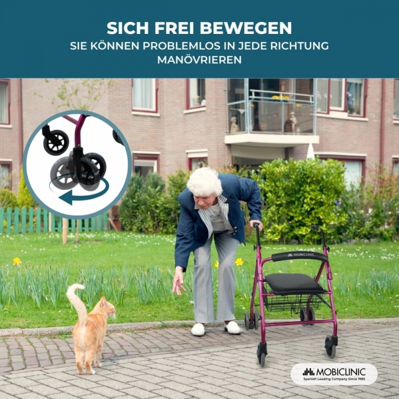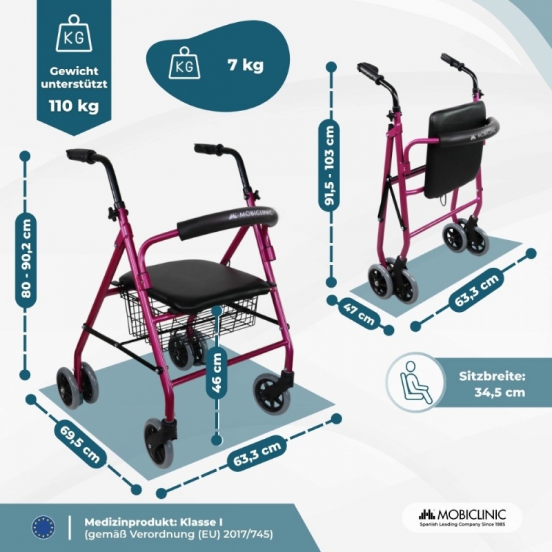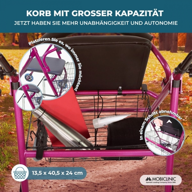 Klappbarer Rollator | inkl. Sitz und Rückenlehne | Aluminium | Korb | für Senioren | Rosa | Modell: Prado | Mobiclinic
