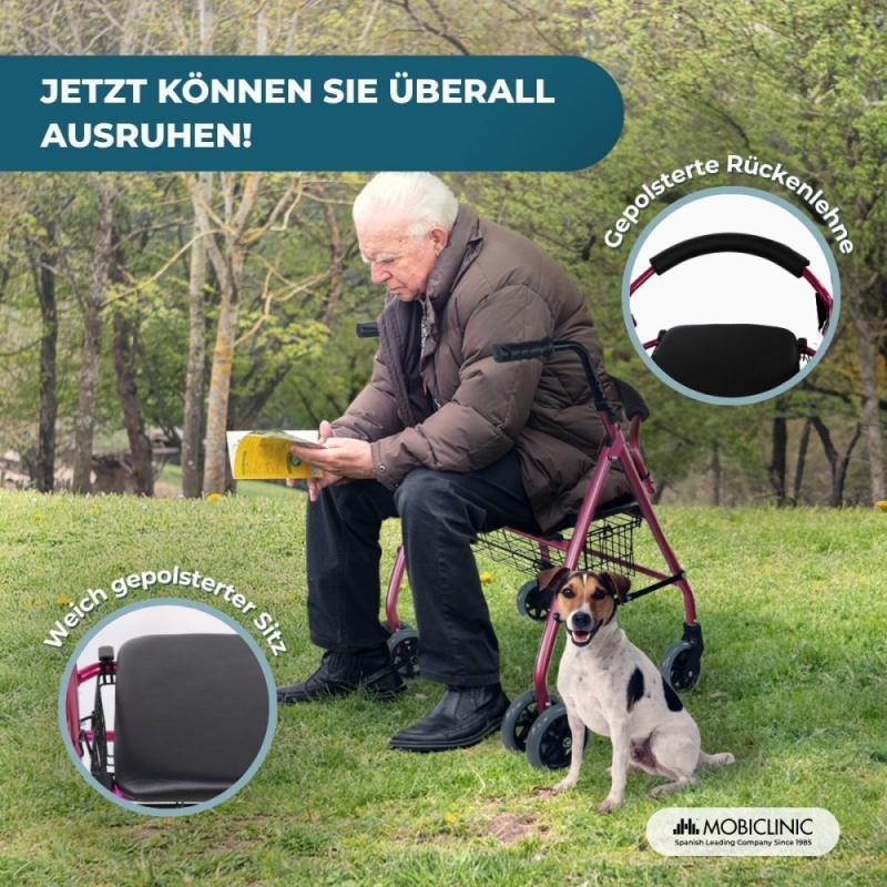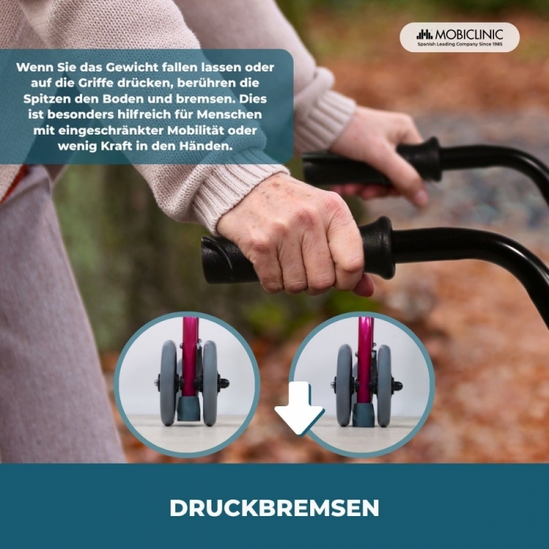 - Sie hat zwei Vorderräder, die sich um 360º drehen lassen, einen bequemen Sitz, auf dem man sich ausruhen kann, eine gepolsterte Rückenlehne und Bremsen, die durch Druck auf die Griffe aktiviert werden (das Gewicht des Körpers wird auf die Griffe übertragen).