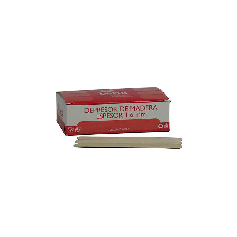 Zungenspatel aus Holz mit abgerundeten Kanten und perfekt poliert, um Reibung zu vermeiden. Karton aus Wellpappe. Jede Box enthält 100 Depressiva.