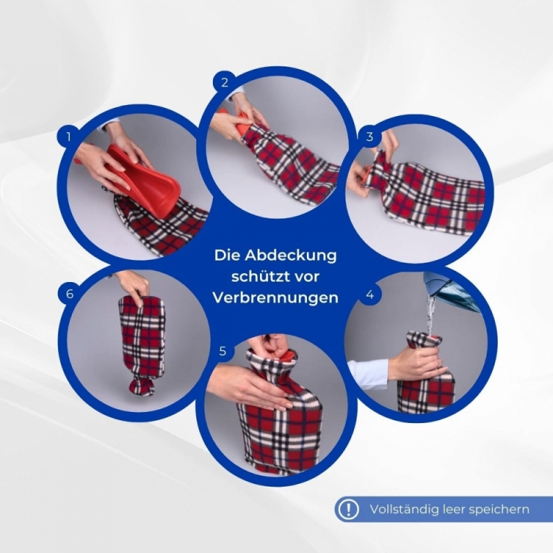 Wenn Sie die Wärmflasche lagern wollen, leeren Sie sie bitte vorher komplett aus. Lagern Sie sie in einem dunklen/kühlen Ort und vermeiden Sie Fett-, Öl- o. Lössemittelflecken. Das Bezug ist mit Seife und warmem Wasser waschbar.