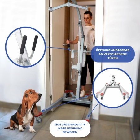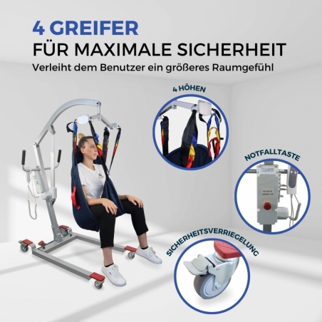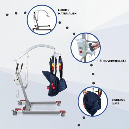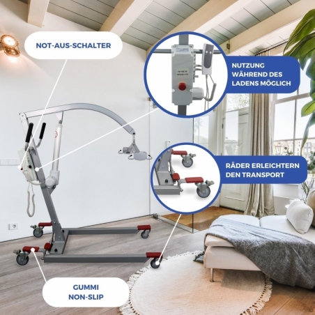 ERHÖHTE SICHERHEIT: Reduziert das Verletzungs- und Sturzrisiko für Patient und Pflegekraft. Der Aufhänger ermöglicht es dem Benutzer, den Patienten während des Transfers festzuhalten und so für Stabilität zu sorgen. Ein Not-Aus-Schalter ermöglicht das manuelle Anheben und Absenken des Patienten bei Bedarf.