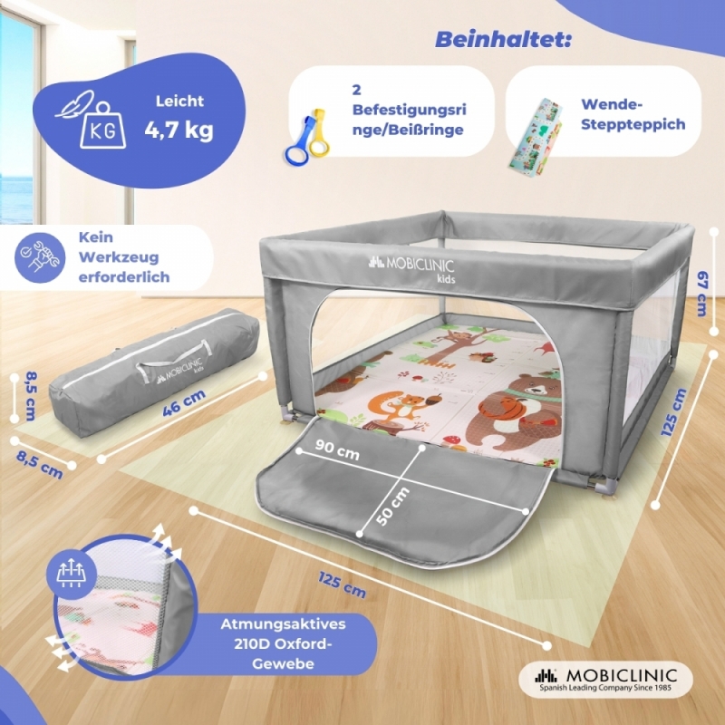 Laufstall mit Teppich | Babys und Kinder | 125x125x67cm| Faltbar | Tragetasche | Grau | Happyland | Mobiclinic