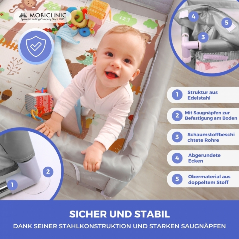 Dieser Baby-Laufstall bietet Kindern einen besonderen Ort , an dem sie ihr Spielzeug genießen können. Diese Funktion trägt dazu bei, in anderen Bereichen des Hauses Ordnung zu halten und erleichtert gleichzeitig die Aufsicht der Eltern . Dank des Laufstalls können Eltern andere Aufgaben erledigen, während sie auf ihre Kinder aufpassen, da sie ihnen eine sichere Umgebung bieten, ohne dass sie ständig beaufsichtigt werden müssen.
