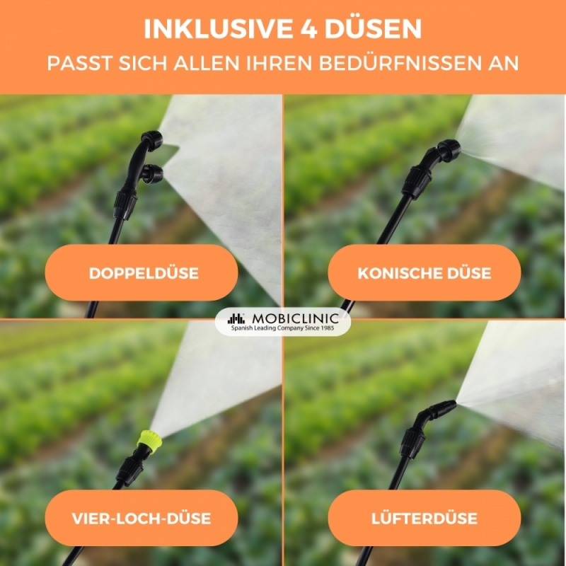 ANPASSBARKEIT AN VERSCHIEDENE AUFGABEN: Das Sprühgerät ist mit 4 verschiedenen austauschbaren Düsen oder Köpfen ausgestattet, die sich an unterschiedliche Bedürfnisse anpassen. Dadurch sind sie vielseitig einsetzbar, da sie für spezifische Anwendungen wie punktuelle Behandlungen oder großflächige Abdeckungen eingesetzt werden können.