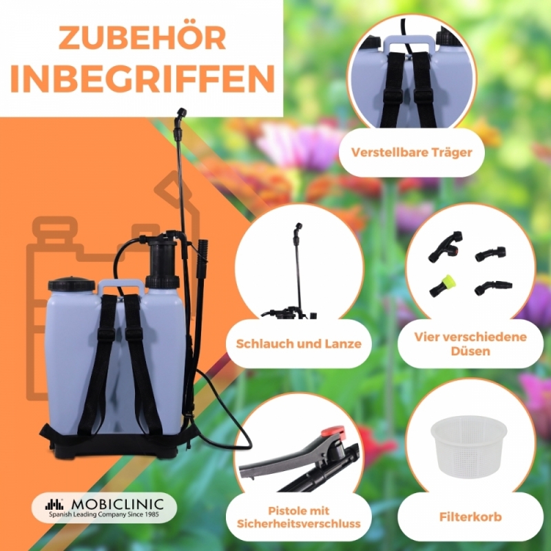 Dieses Sprühgerät ermöglicht eine präzise Kontrolle der Menge der aufgetragenen Flüssigkeit, was für die Anpassung der Dosierung an die spezifischen Anforderungen jeder Aufgabe unerlässlich ist. Seine Anpassungsfähigkeit wird durch 4 austauschbare Düsen hervorgehoben, die den Einsatz in verschiedenen Anwendungen ermöglichen, von lokalen Behandlungen bis hin zu großflächigen Behandlungen. Sein Fassungsvermögen beträgt 16L.