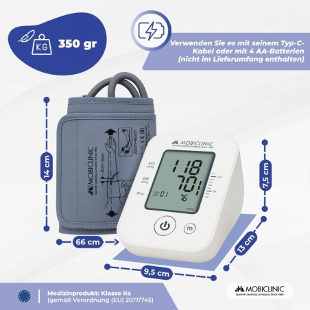 Dieses Blutdruckmessgerät wird sowohl mit Batterien als auch über das mitgelieferte USB-Kabel betrieben, passt sich den Bedürfnissen jedes Benutzers an und ermöglicht die Verwendung sowohl zu Hause als auch auf Reisen.